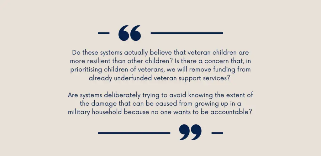 I have spent years scratching my head at their lack of engagement. Do these systems actually believe that veteran children are more resilient than other children? Is there a concern that, in prioritising children of veterans, we will remove funding from already underfunded veteran support services? Are systems deliberately trying to avoid knowing the extent of the damage that can be caused from growing up in a military household because no one wants to be accountable?