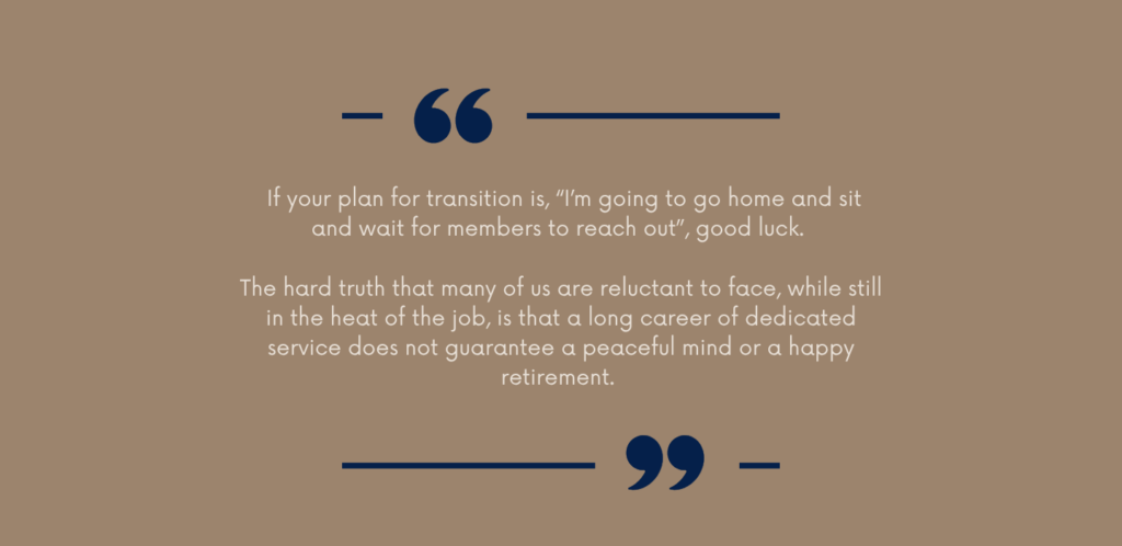 He warned his peers that, if your plan for transition is, “I’m going to go home and sit and wait for members to reach out”, good luck. The hard truth that many of us are reluctant to face, while still in the heat of the job, is that a long career of dedicated service does not guarantee a peaceful mind or a happy retirement.